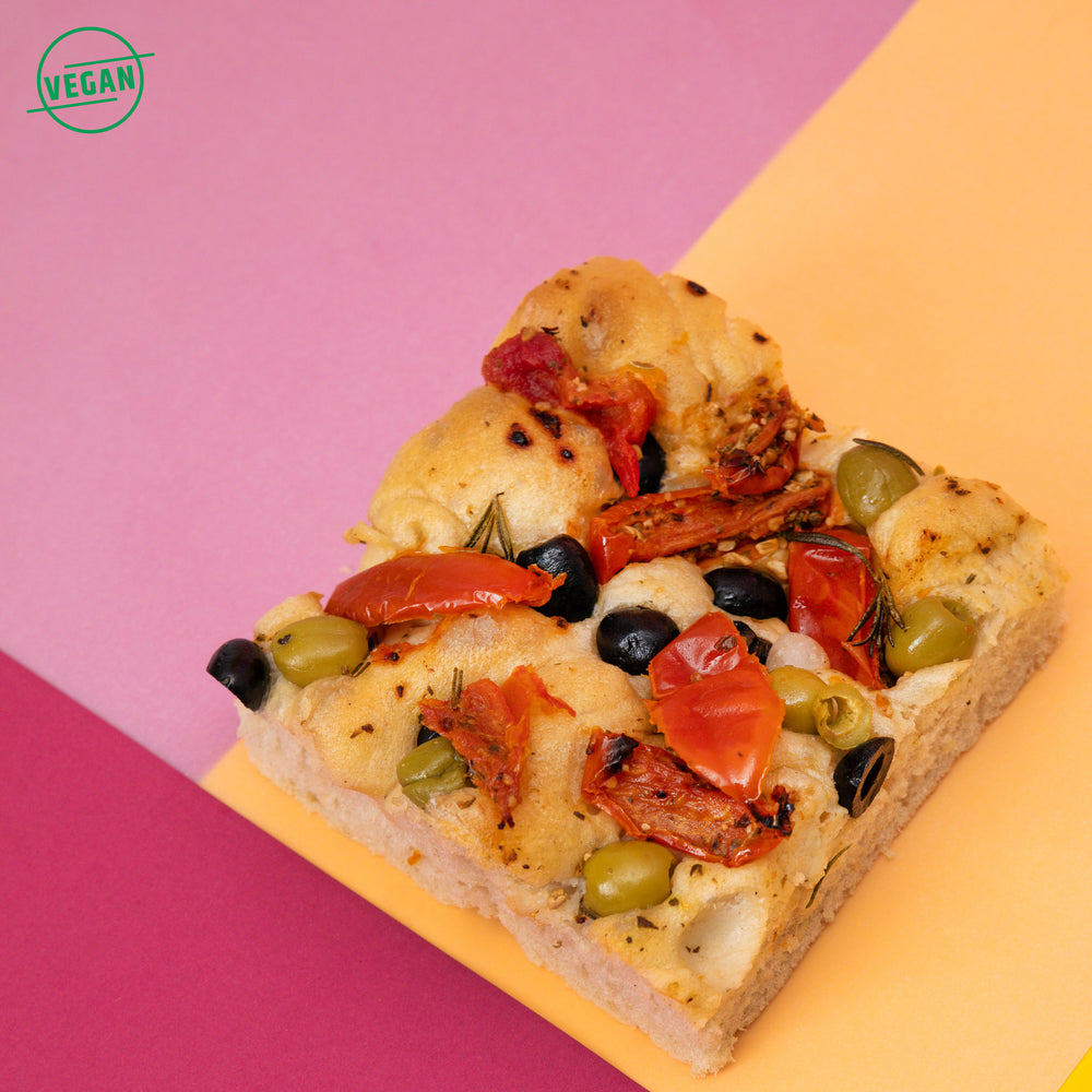 Probier' doch mal unser luftiges Focaccia. Belegt mit aromatischen, getrockneten Tomaten und zweierlei Olivensorten. Abgerundet wird der Geschmack mit Rosmarin.