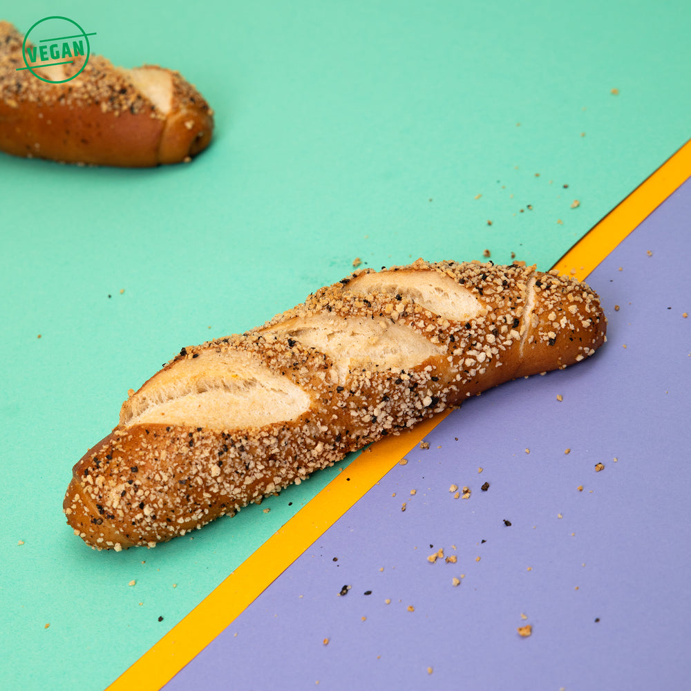 Leckere, lockere Laugenstange, die besonders aromatisch und fluffig ist. Sie ist verfeinert mit Pfeffer und Salzdekor.