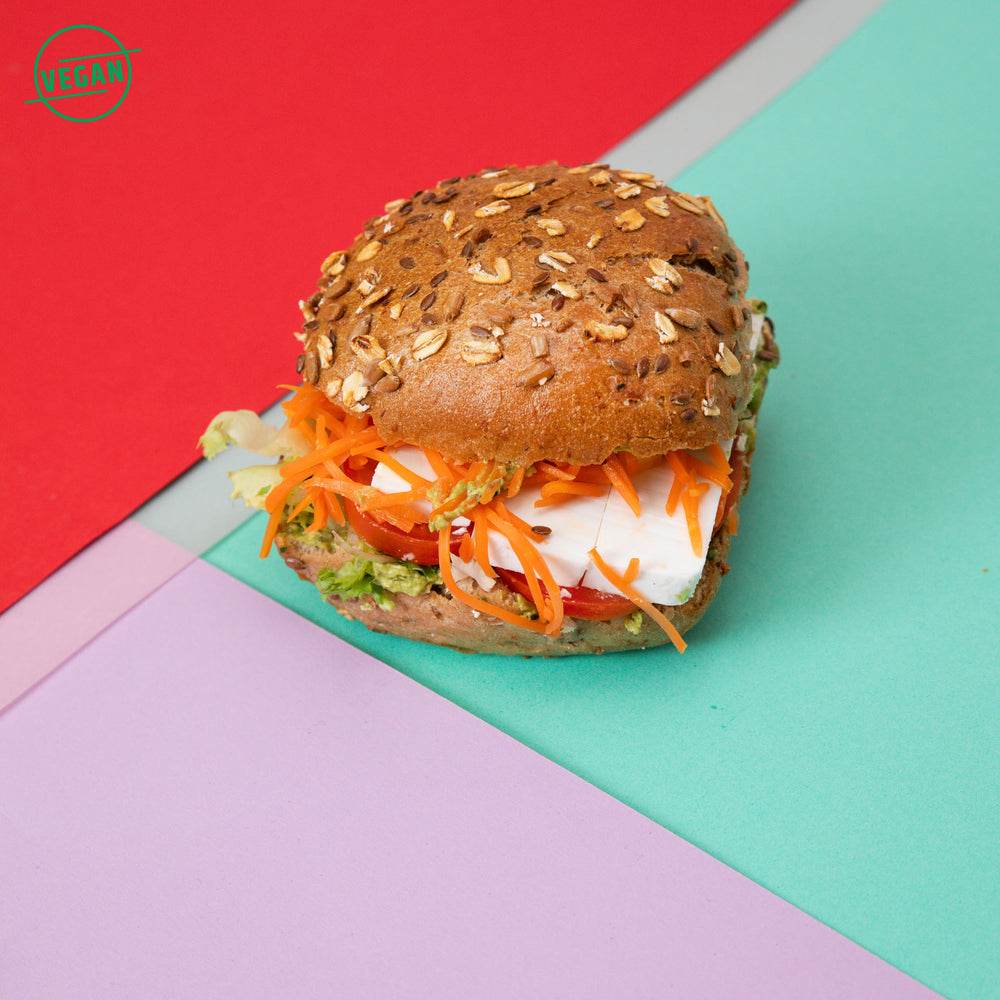 Unser aromatisches Ofenfrisches Mehrkornbrötchen wird bestrichen mit unserem selbst hergestelltem Avocado-Basilikumaufstrich. Getoppt mit rein pflanzlichem Hirtenkeese (Firma: Violife), Frisee-Salat, Tomate und Möhrensalat mit Äpfeln.