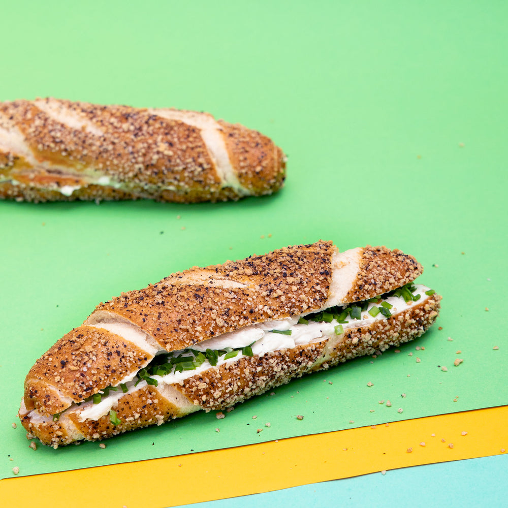 Unsere aromatischen Kürbiskernbrötchen werden mit Remoulade bestrichen und anschließend liebevoll mit Rührei und Schnittlauch von unserem Snack-Team belegt. Verfeinert wird das Brötchen mit Tomate, Gurke und Salat.