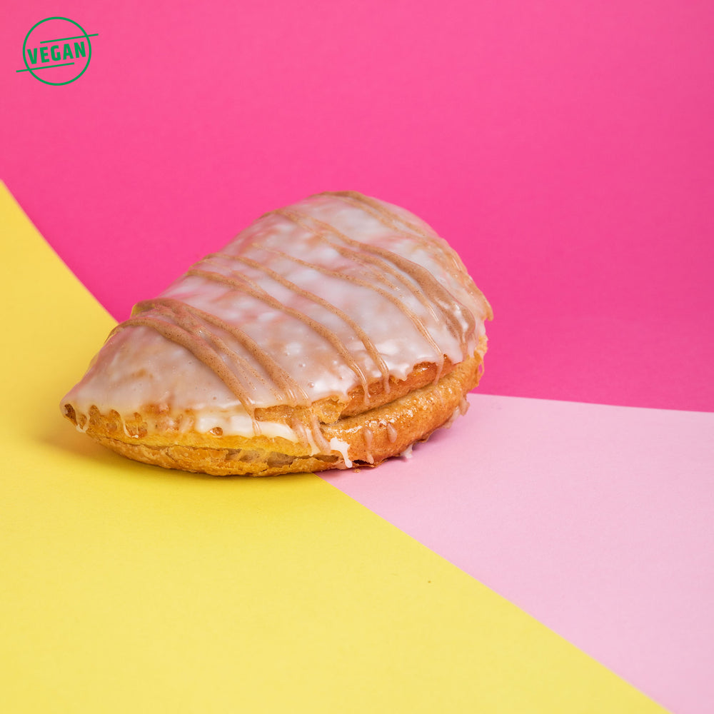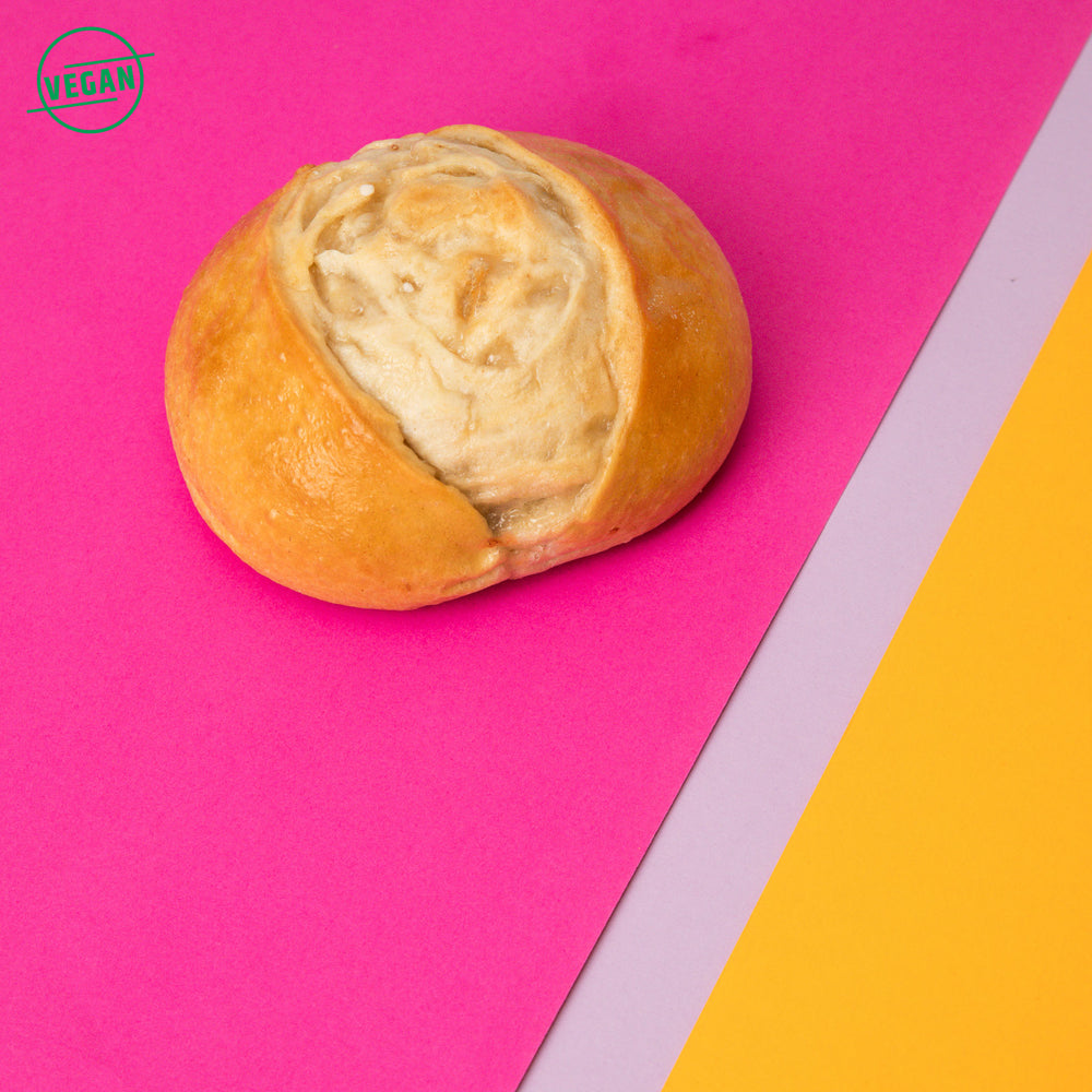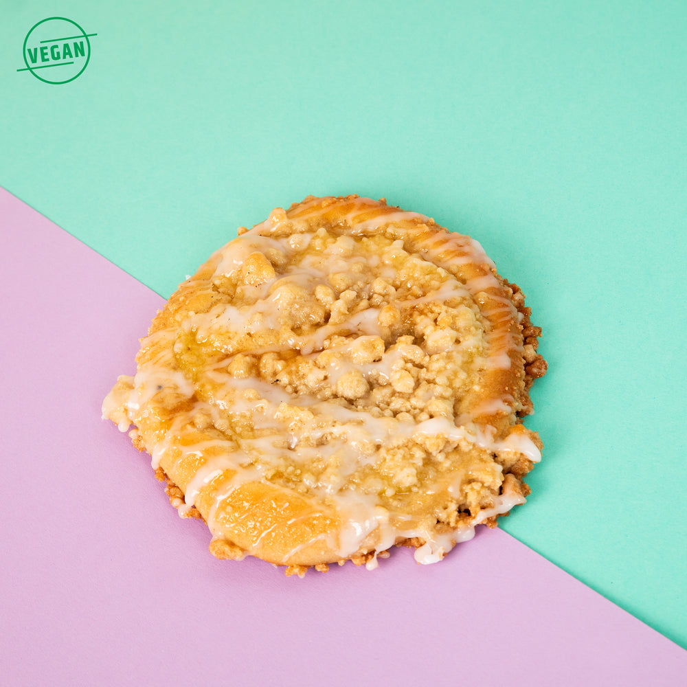 Hefeteig, der reichlich mit jeder Menge pflanzlichem Pudding und Streusel bedeckt wird. Anschließend wird der Taler mit Aprikose und Fondant veredelt.