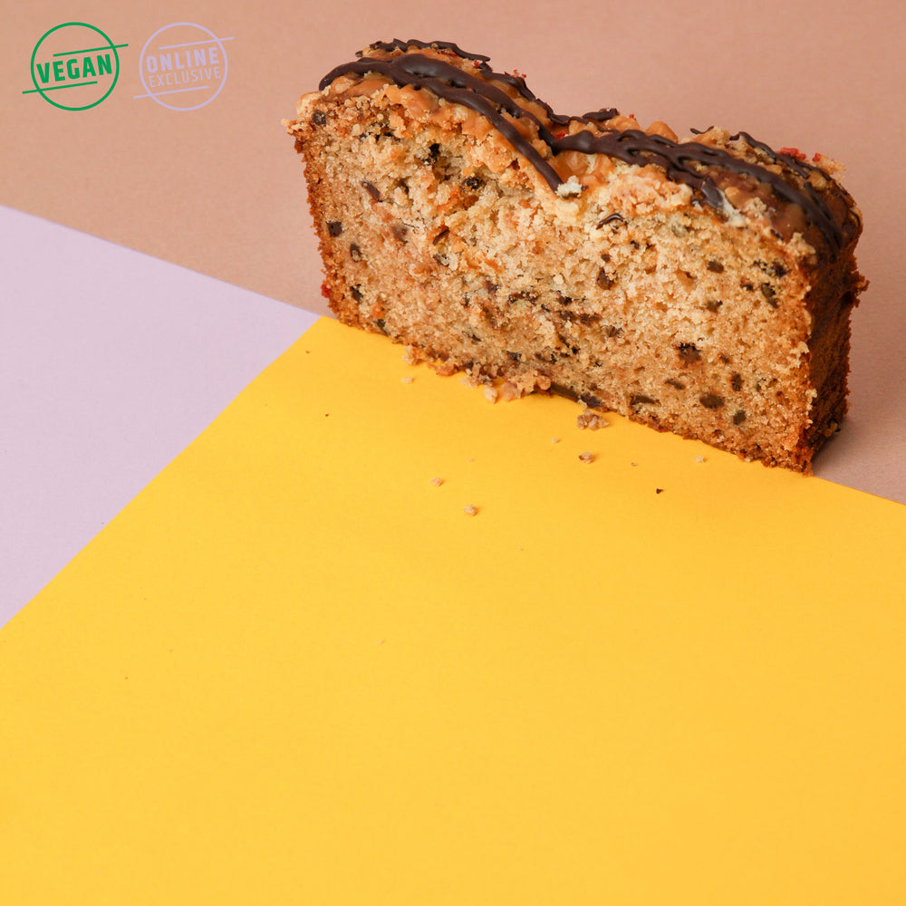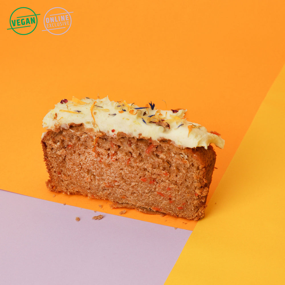 Ultra saftiger, veganer Möhren Kuchen und saftigem Topping. Veredelt mit essbaren getrockneten Blüten.