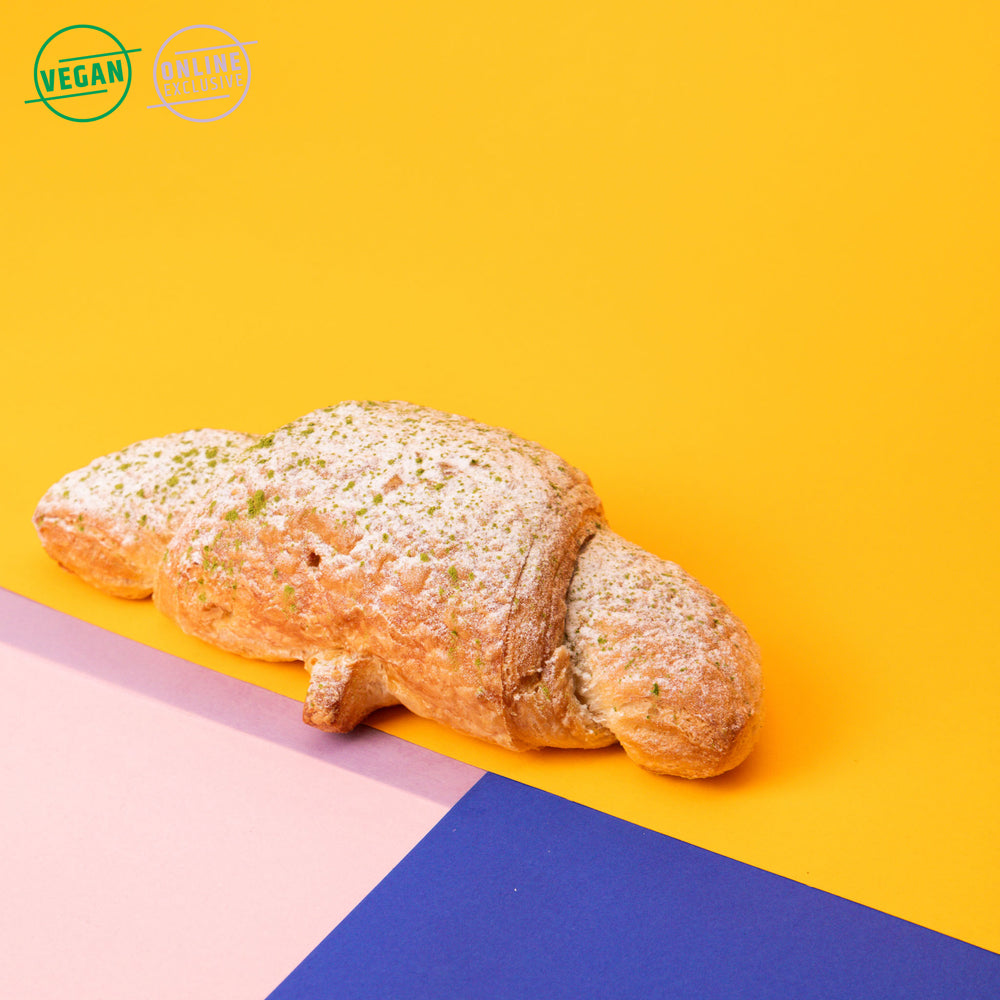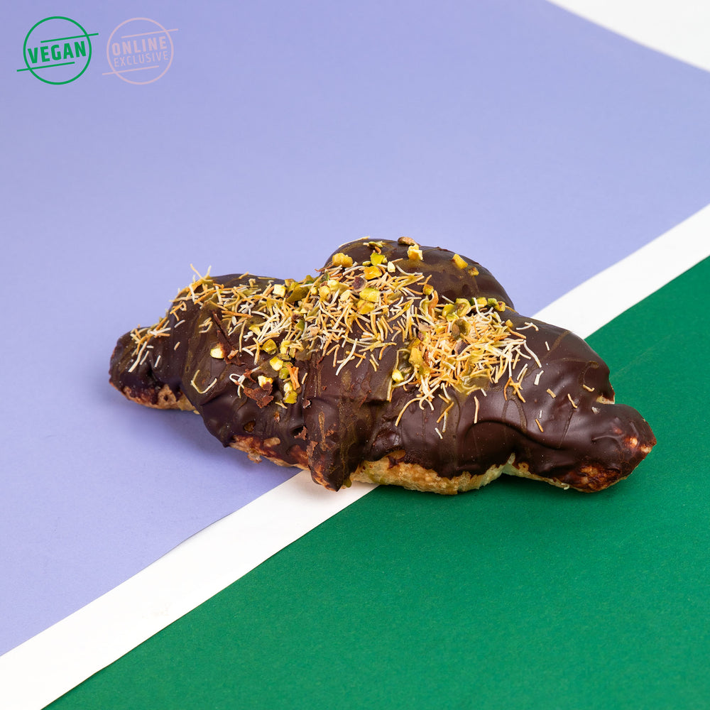 Pistazienliebhaber*innen aufgepasst! Unser fluffiges Croissant mit Pistazienfüllung und Kadayif (Engelshaar) wird getoppt mit jeder Menge Schokolade.